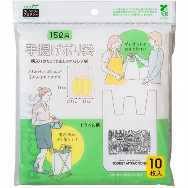 ■【商品名】: 【まとめ買い】手提げポリ袋15L用 10枚トラベル柄×10点セット ■【商品分類】:日用雑貨:掃除用品:ゴミ袋・ポリ袋・レジ袋 ■【JAN】:4903652002322 ■【出荷目安】:1〜5営業日(※土日祝除く)。 ■【返品/キャンセル】:注文後のキャンセル、初期不良以外のお客様都合の返品はできません。 ■【領収書・適格請求書の発行について】:資源保護のためペーパーレスを実施しておりますので同封致しません。必要の方は、注文履歴にて、Yahooシステム発行の電子領収書をダウンロードしてください。 <b>##商品詳細情報(単品)##</b> ■【容量】:10枚 ■【原産国】:フィリピン ■【メーカー名】:【 ネクスタ 】 ■【説明】:ショッピングバッグ・室内ゴミ袋として使用するちょっとおしゃれなレジ袋。 2リットルのペットボトルが6本入る大きさです。