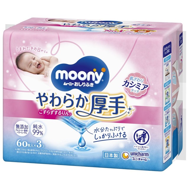 ■【商品名】: 【まとめ買い】ムーニーおしりふきやわらか厚手詰替60枚×3×8点セット ■【商品分類】:美容・健康:衛生日用品:ウェットティッシュ・おしりふき ■【JAN】:4903111157907 ■【出荷目安】:1〜5営業日(※土日祝除く)。 ■【返品/キャンセル】:注文後のキャンセル、初期不良以外のお客様都合の返品はできません。 ■【領収書・適格請求書の発行について】:資源保護のためペーパーレスを実施しておりますので同封致しません。必要の方は、注文履歴にて、Yahooシステム発行の電子領収書をダウンロードしてください。 <b>##商品詳細情報(単品)##</b> ■【容量】:180枚 ■【原産国】:日本 ■【メーカー名】:【 ユニ・チャーム(ユニチャーム) 】 ■【説明】:水分たっぷりでしっかりふける。水分たっぷり層にうんちなじみ成分を配合しているので、時間が経ったこびりつきうんちにもサッとなじんで、こすらずするりんっ!とふいてあげられます。