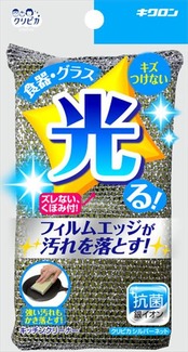 ■【説明】:ポリエステルフィルムのエッジで汚れをかき落とします。中心のエクボ縫製がスポンジの偏りを防いで、二つ折り洗いがしやすくなっています。銀イオン抗菌加工です。