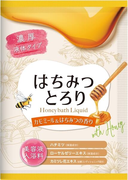 ■【説明】:分包タイプの美容液入浴料。肌に潤いを与えうるすべ肌へ。ハチミツ(保湿成分)、ローヤルゼリーエキス(保湿成分)、カミツレ花エキス(皮膚コンディショニング成分)配合。カモミール&はちみつの香り。ミルキーホワイトの湯色。