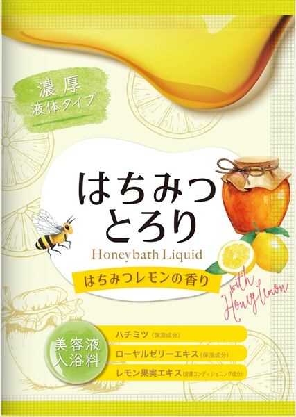 ■【説明】:分包タイプの美容液入浴料。肌のキメを整え、すべツヤ肌へ。ハチミツ(保湿成分)、ローヤルゼリーエキス(保湿成分)、レモン果実エキス(皮膚コンディショニング成分)配合。はちみつレモンの香り。ミルキーホワイトの湯色。