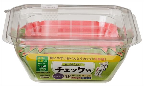 ■【説明】:おべんとカップ人気のチェック柄に定番の赤・黄・緑に+紺色を追加しています。外装容器にバイオマス10%含有PETを使用。