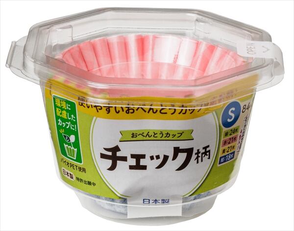 ■【説明】:おべんとカップ人気のチェック柄に定番の赤・黄・緑に+紺色を追加しています。外装容器にバイオマス10%含有PETを使用。