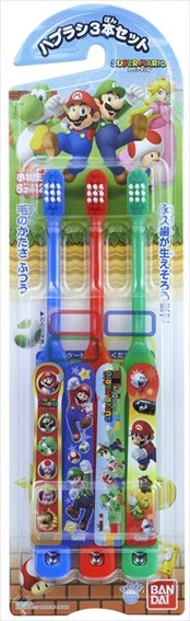 ■【説明】:『スーパーマリオ』の使いやすいハブラシ3本セット!奥歯まで磨きやすいコンパクトヘッド。仕上げ磨きしやすい太いグリップ。選べる4種類のデザインシール付き!