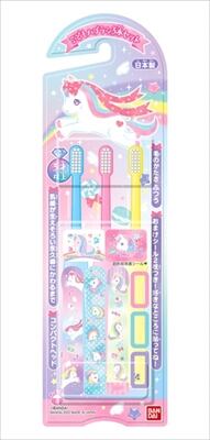 ■【説明】:女の子に人気のユニコーンをモチーフにしたハブラシ3本セット。歯ぐきを傷めない丸い毛先、奥歯まで磨きやすいコンパクトヘッド。正しい握り方がわかりやすい親指ストッパー。キャラクターシールデザイン全3種。