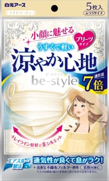 【まとめ買い】ビースタイル プリーツタイプ 涼やか心地 ライトベージュ5枚入 【 白元アース 】 【 マスク 】【HRM-18849775-3】×10点セット