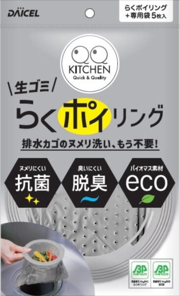 ■【説明】:排水カゴを使わない新発想のゴミ受け。シンクに馴染み、汚れが目立ちづらいグレー。リング本体に抗菌剤、専用袋に脱臭・抗菌剤を配合でヌルヌルや嫌なにおいを抑えます。