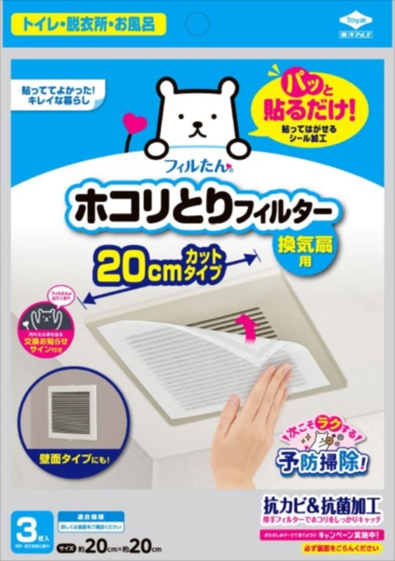 ■【説明】:トイレや脱衣所、お風呂の換気扇用。パッと貼るだけで取付簡単、ホコリをキャッチするフィルター。20cm。