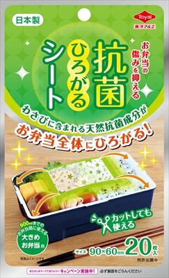 ■【説明】:作ったお弁当の上に置き、お弁当の傷みを抑える抗菌シートです。「拡散型」タイプなので接触面だけでなくお弁当全体に効果を発揮します。カットして使えるので、お弁当箱サイズに合わせれます。食べる際には気にならない、わさびの香りで効果を実感。安心の食品由来の天然抗菌成分を使用。メッセージ入り。