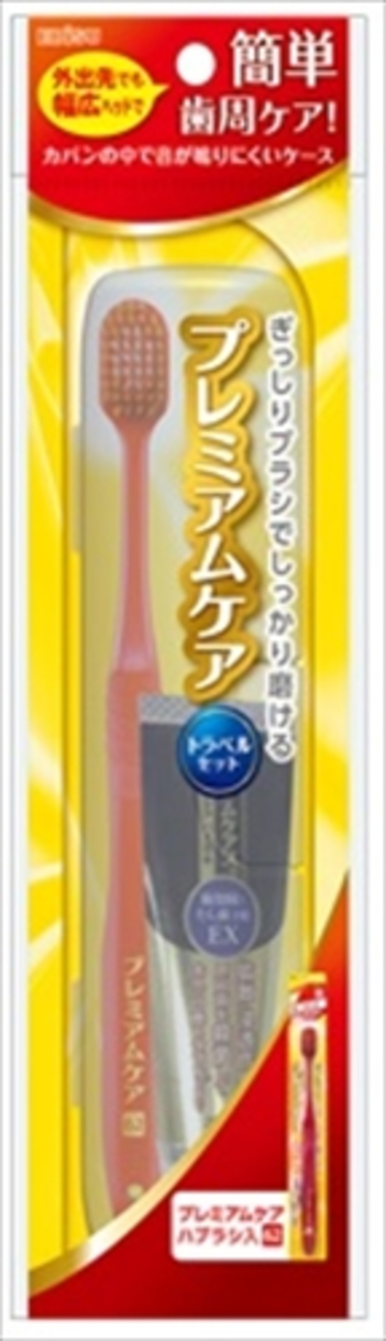 ■【説明】:外出先でも幅広ヘッドで簡単に歯周ケアできるプレミアムケアのトラベルセット。「プレミアムケアハブラシ・6列レギュラーふつう」と大人の口腔トラブルを防ぐ薬用トータルケアハミガキ「プレミアムケアズ 歯周病とむし歯 EX 30g」入り。ハブラシとハミガキが固定でき、カバンの中で音が鳴りにくいケース。