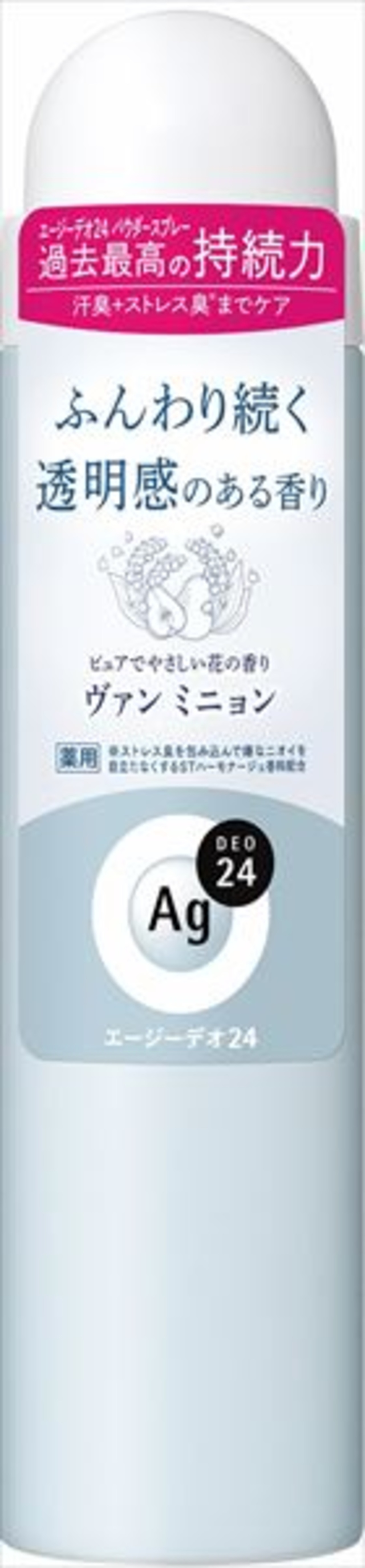 ■【説明】:24時間、肌快適ケア。いつでもどこでもずーっと快適な肌を願う人へ。ニオイ菌、集中殺菌(有効成分:イソプロピルメチルフェノールSP複合体)!汗臭対応。ストレス臭*ケア。汗・皮脂対応。高密着処方。*ストレス臭を包み込んで嫌なニオイを目立たなくするSTハーモナージュ香料配合。S、ピュアでやさしい花の香りヴァン ミニョン、(販売名:パウダースプレー fA(VM))