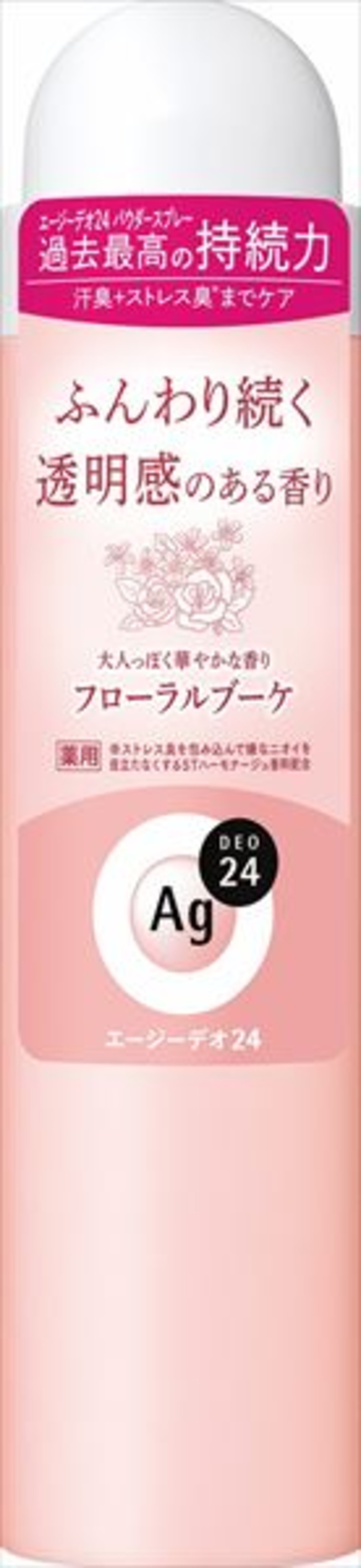 ■【説明】:24時間、肌快適ケア。いつでもどこでもずーっと快適な肌を願う人へ。ニオイ菌、集中殺菌(有効成分:イソプロピルメチルフェノールSP複合体)!汗臭対応。ストレス臭*ケア。汗・皮脂対応。高密着処方。*ストレス臭を包み込んで嫌なニオイを目立たなくするSTハーモナージュ香料配合。S、大人っぽく華やかな香りフローラルブーケ、(販売名:パウダースプレー fA(FB))