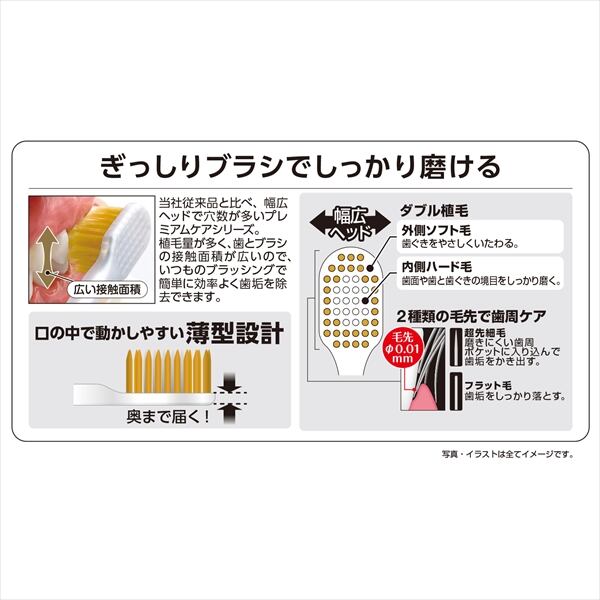 ■【説明】:ハブラシの常識を変える幅広ヘッドの「プレミアムケアシリーズ」がパッケージリニューアル。ヘッドサイズと毛の硬度表示をより分かりやすいデザインに変更。ヘッドの厚さが当社従来品より約25%薄くなり口の中で動かしやすい薄型設計。超先細毛とフラット毛の2種類の毛先で歯周ケア。外側ソフト毛で歯ぐきをやさしくいたわり、内側ハード毛で歯面や歯と歯ぐきの境目をしっかり磨く。効率よく磨ける6列レギュラーヘッド。