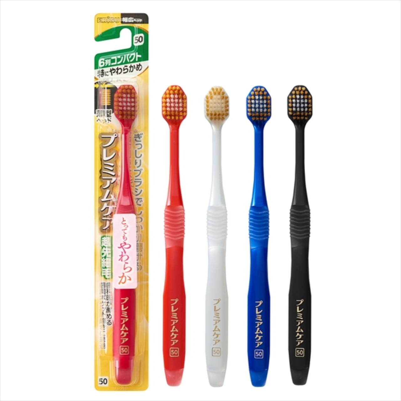 ■【説明】:ハブラシの常識を変える幅広ヘッドの「プレミアムケアシリーズ」がパッケージリニューアル。ヘッドサイズと毛の硬度表示をより分かりやすいデザインに変更。ヘッドの厚さが当社従来品より約25%薄くなり口の中で動かしやすい薄型設計。超先細毛とフラット毛の2種類の毛先で歯周ケア。外側ソフト毛で歯ぐきをやさしくいたわり、内側ハード毛で歯面や歯と歯ぐきの境目をしっかり磨く。狭い所にも届きやすい6列コンパクトヘッド。