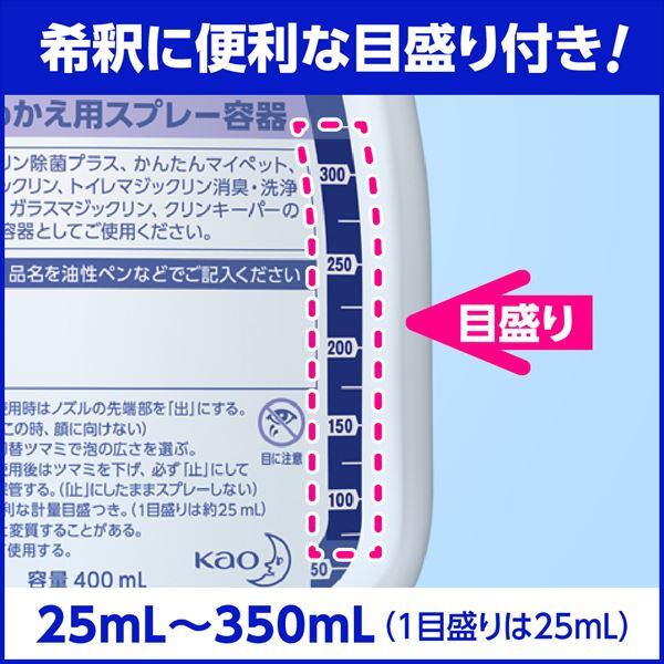 ■【説明】:マジックリン除菌プラス、かんたんマイペット、バスマジックリンシリーズ、トイレマジックリン消臭・洗浄スプレーシリーズ、ガラスマジックリン、クリンキーパーに使用できる、住居用洗剤つめかえ用スプレー容器です。希釈に便利な計量目盛り付きです。長期間の使用でもラベルがはがれにくい容器です。ノズルの切替つまみでスプレーする泡の広さを選べます。