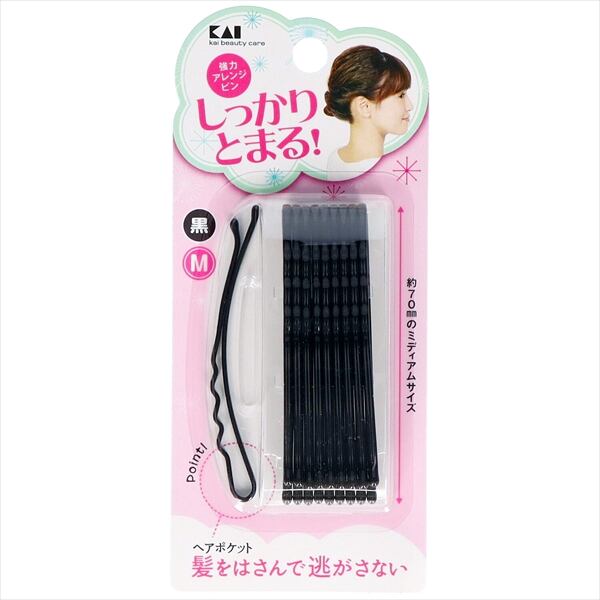 ■【説明】:ヘアポケットでしっかりと髪をホールドするので、不器用さんでも使いこなすことができる人気のヘアピンです。ねじり髪もしっかりキープ!思い通りのヘアアレンジを叶えます。Mサイズで、黒色のヘアピンです。