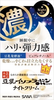 ■【説明】:豆乳のリンクルナイトクリーム。ピュアレチノール※1を配合!濃厚クリームがじっくり浸透※2するおやすみパック処方でエイジングケア※3。べたつかないから、寝返りをしても気になりません。乾燥による小じわを目立たなくします(効能評価試験済み)。 ※1:保湿成分 ※2:角層まで ※3:年齢に応じたお肌のお手入れ