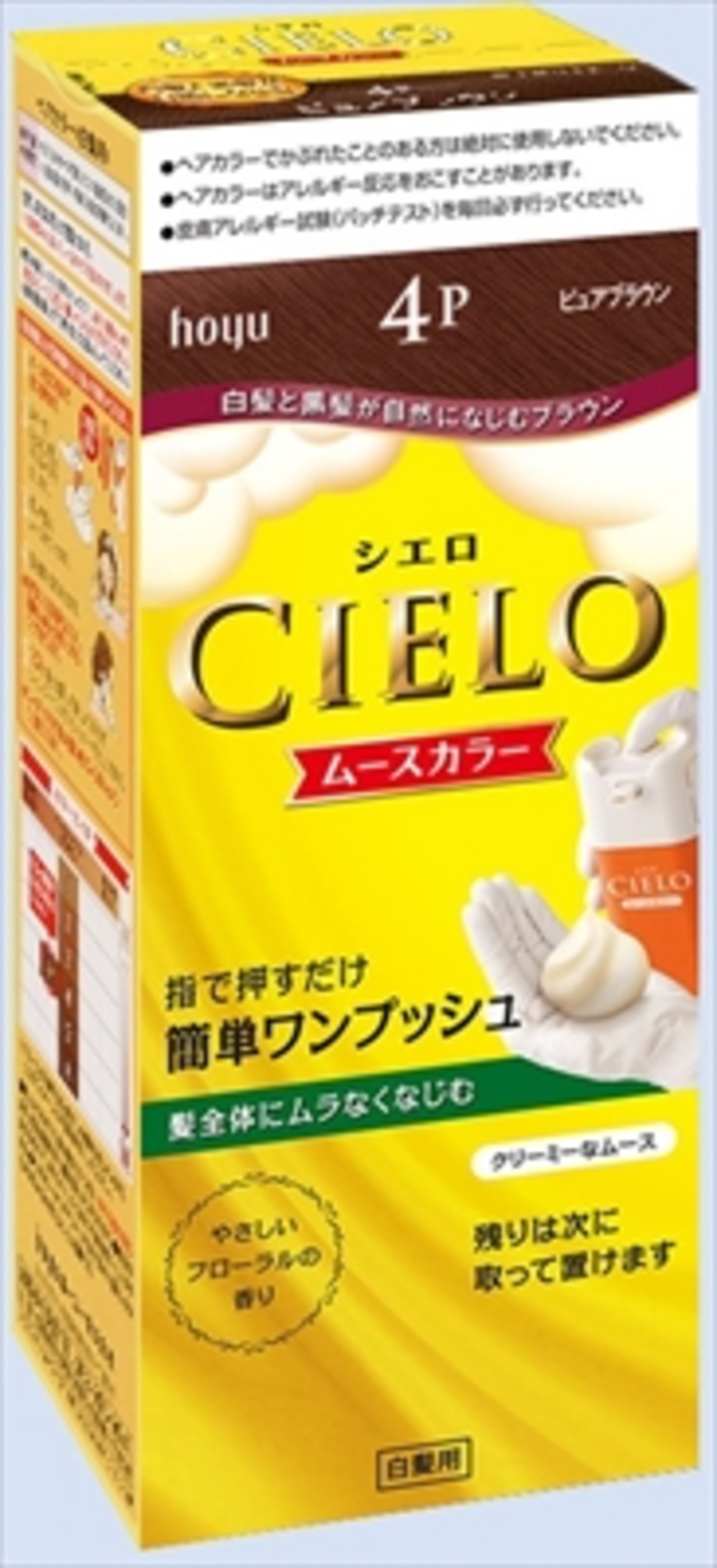 ■【説明】:押すだけムースの簡単ワンプッシュ。シエロ ムースカラー新登場!指で押すだけ、簡単にムースを出せて、手間なく髪全体を塗れます。クリーミーなムースが、髪になじんでムラなく染まり、なめらかな仕上がり。