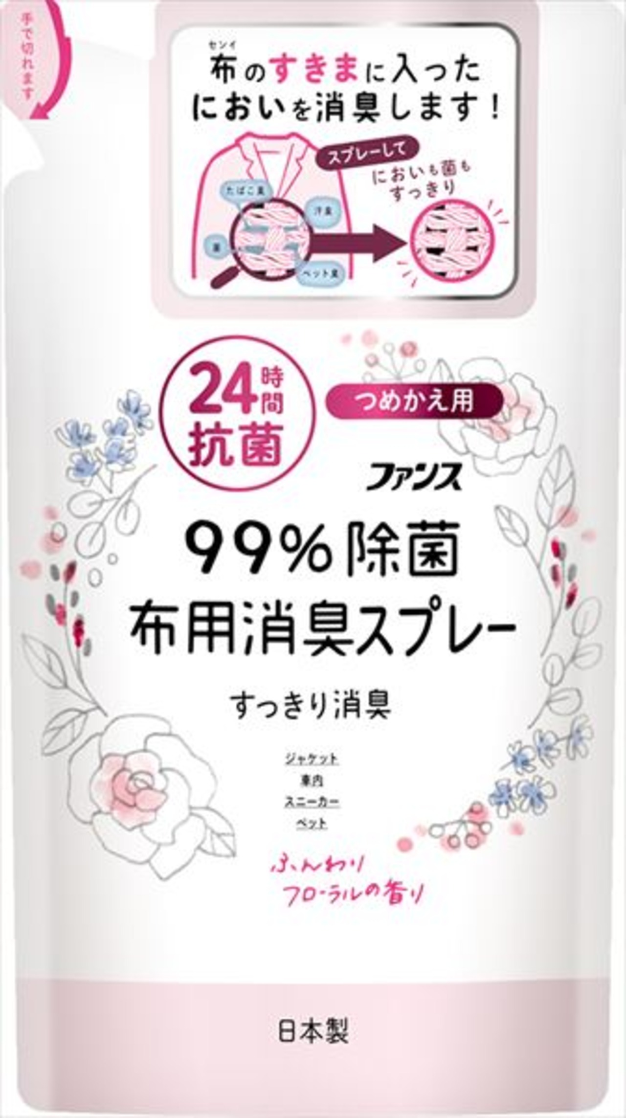 ■【説明】:99%除菌、24時間抗菌。衣類と布製品についたイヤなニオイをしっかり消臭・除菌します。