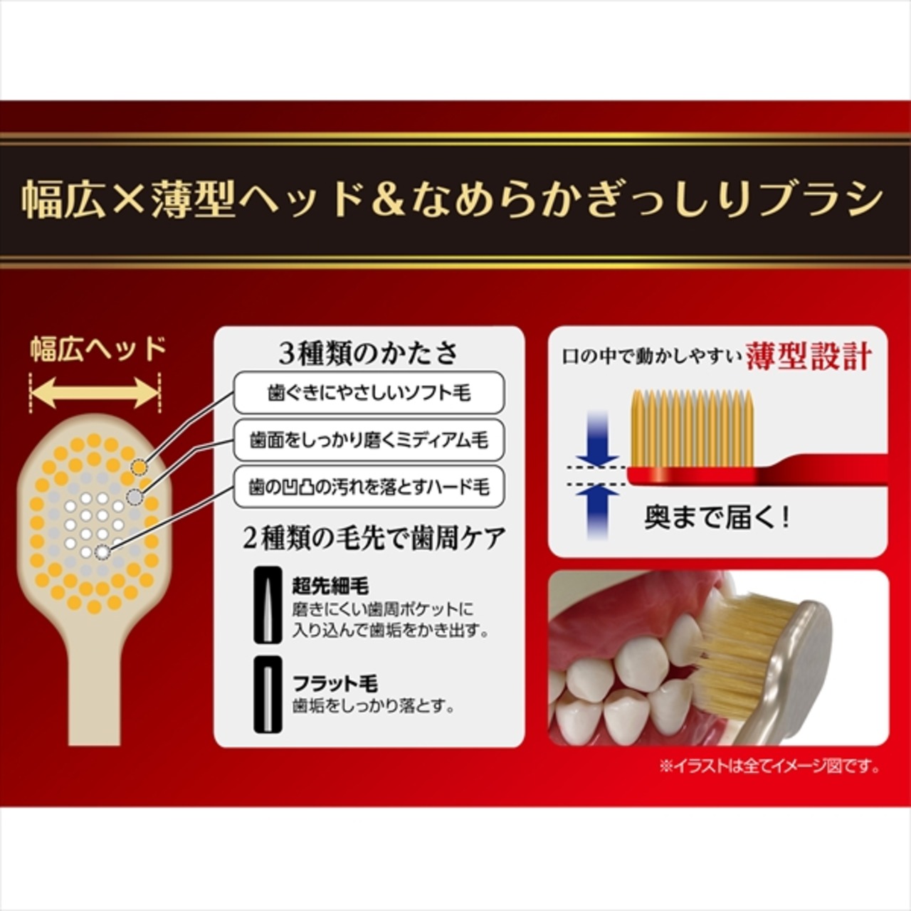 ■【説明】:幅広ヘッドハブラシの頂点へ「ザ・プレミアムケア」がパッケージリニューアル。ヘッドサイズと毛の硬度表示をより分かりやすくし、ベースカラーを明るくしてブランド名の視認性を。薄型ヘッドで磨き残しの多い奥歯まで毛先が届く。歯ぐきにやさしいソフト毛、歯面を磨くミディアム毛、歯の凹凸の汚れを落とすハード毛の3種類の毛のかたさ。超先細毛とフラット毛の2種類の毛先。歯を広くカバーする8列レギュラーヘッド。
