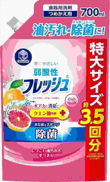 ■【説明】:手にやさしい弱酸性タイプ。生臭いニオイも消臭します。クエン酸配合でシンクの水アカ汚れも浮かせて落とします。ピンクグレープフルーツの香りで除菌もできます。お得な大容量700mlサイズ。