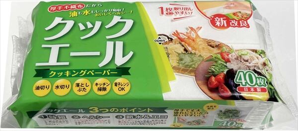 ■【説明】:水や油の吸収性に優れた、濡れても破れにくい不織布タイプのクッキングペーパーです。