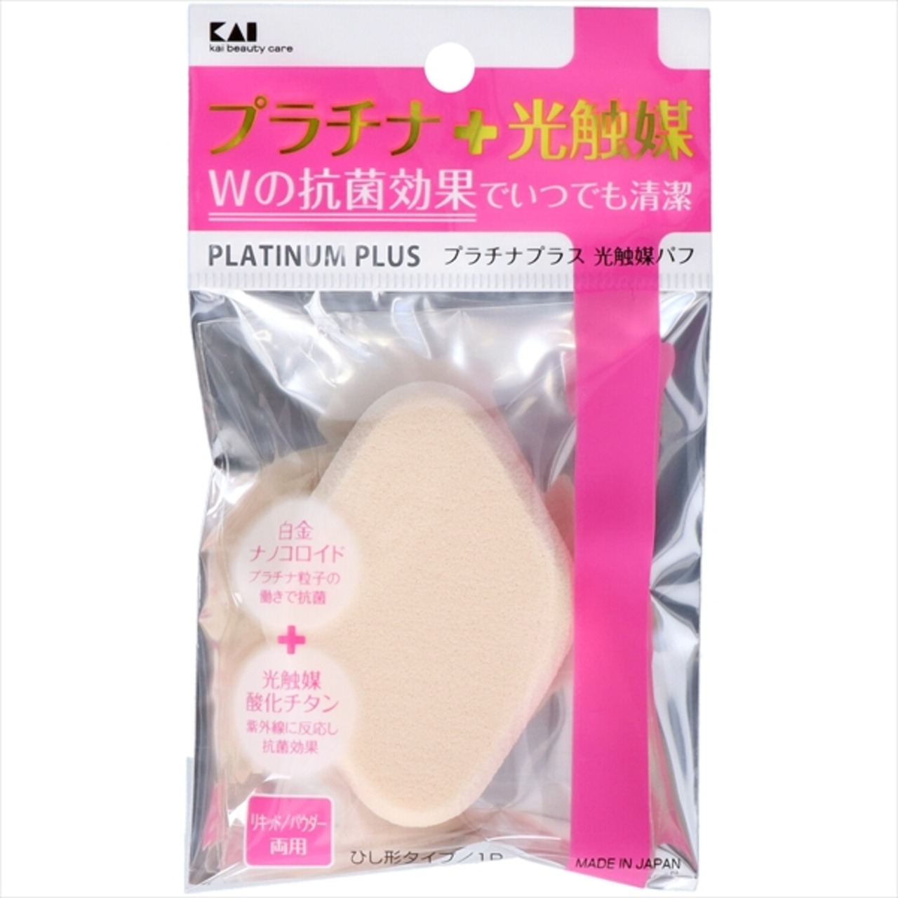 ■【説明】:プラチナ+光触媒 Wの効果でいつも清潔なパフ。