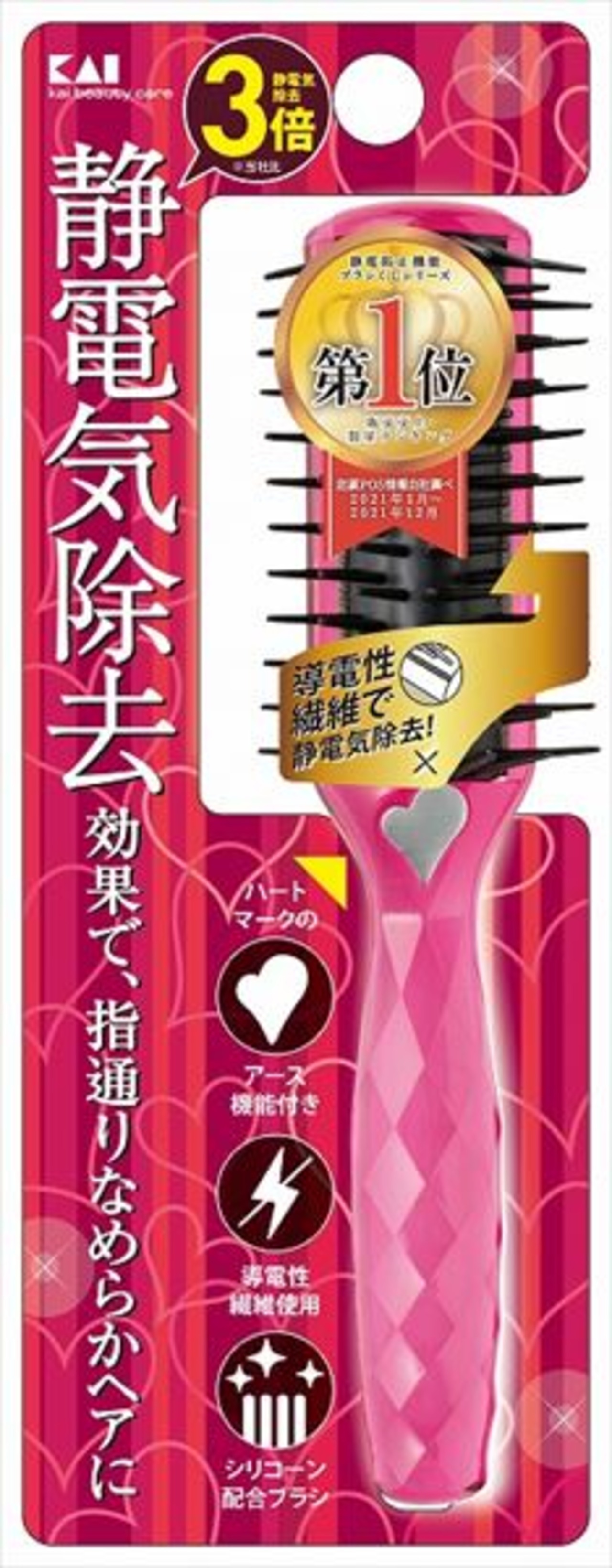 ■【説明】:旅客機の座席シートにも採用されている除電効果の高い繊維を配列した静電防止ブラシです。ハートデザインのアルミシールに触れながら使用することでさらに静電気を逃し、髪のもつれや絡まりによる切れ毛・枝毛が起こりにくくなります。また、シリコーン含有のブラシなので、髪通りもよりスムーズになります。