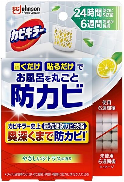 ■【説明】:●防カビ効果の高いカラシナの種子から抽出したエッセンシャルオイルを配合。●カビキラー史上最先端の防カビ技術で、タイル目地等の小さな穴(細孔)や狭い隙間の奥深くまで防カビ成分が届く!●6週間効果が持続!●置くだけ・貼るだけの簡単な使用方法
