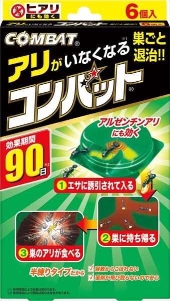 ■【説明】:使いやすいミニタイプのアリ用ベイト剤。アリの習性を利用した連鎖効果で、アリを巣ごと退治します。アルゼンチンアリにも効く。効果は約90日。6個入。