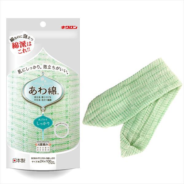 ■【説明】:キクロン独自製法の4重編みで、泡立ち、すすぎ、乾燥、の全てにご満足いただき人気のボディタオル「泡綿」にしっかりタイプが新登場。表生地は独特のシャリ感を持つ特殊綿糸と通常綿糸の2種類の綿糸を使用することで、お肌に優しい天然綿100%で独自のしっかり感を生み出します。中生地には泡立ち繊維を使用し、泡綿の特長はそのまま、抜群の泡立ちです。カラーは清潔さとさわやかさをイメージできるグリーン系です。
