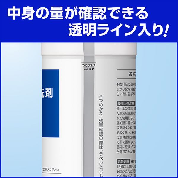■【説明】:液体洗たく用洗剤専用のつめかえ計量容器です。つめかえ時に液面確認可能な透明ライン入りで、液がこぼれるのを防ぎます。