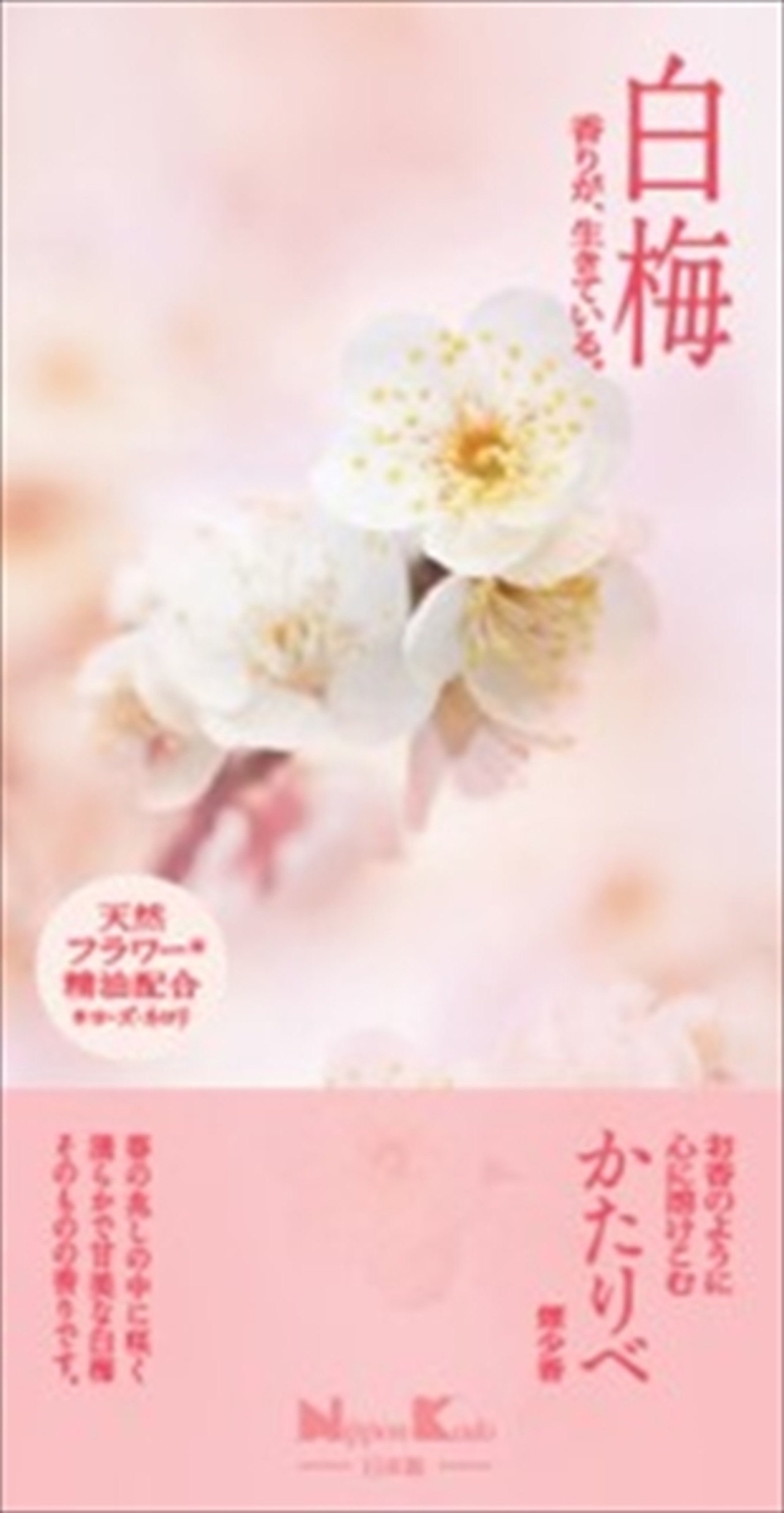 ■【説明】:最大の魅力は、その豊かな香り。自然の恵みから抽出した精油も配合し、花々の息吹を感じるみずみずしい香りを調香師の手によって創りあげました。春の兆しの中に咲く、清らかで甘美な白梅そのものの香りです。天然フラワーの精油配合。けむり少なめ。燃焼時間:約25分