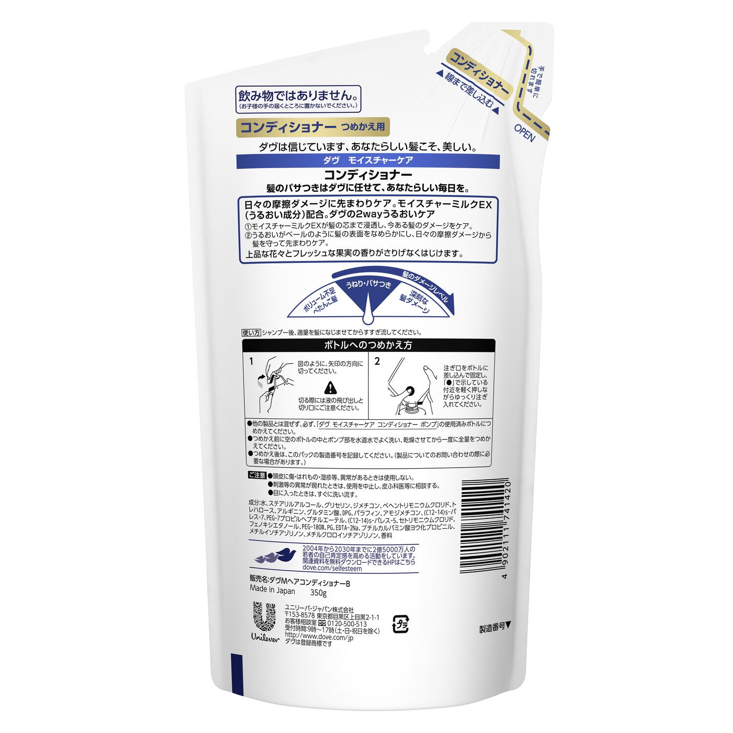 ■【説明】:モイスチャーミルクEXが1.髪になじんで内側まで浸透し、うるおいを届ける。2.髪の外側をベールのようにつつみこみ、うるおいを守る。ダヴの2Wayケアで、髪の内側も外側もうるおいケア。うっとりするほど、なめらかな髪へ。