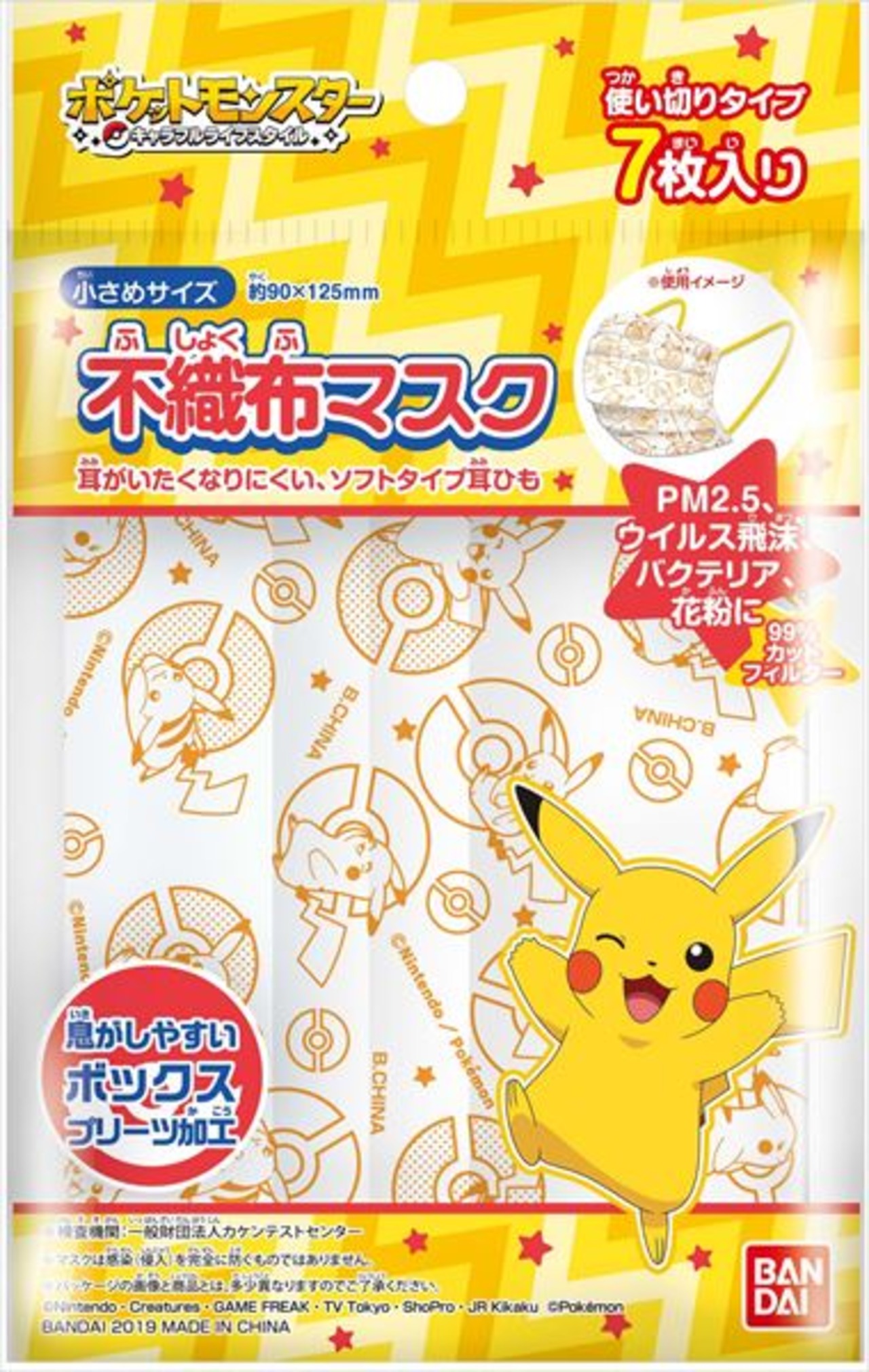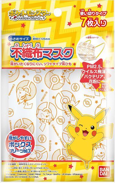 ■【説明】:ポケットモンスターの子供用不織布マスク。お買い得感のある7枚入り!耳が痛くなりにくいソフトタイプの耳ひもです。息がしやすいボックスプリーツ仕様。ほこりなど99%カットフィルター採用。