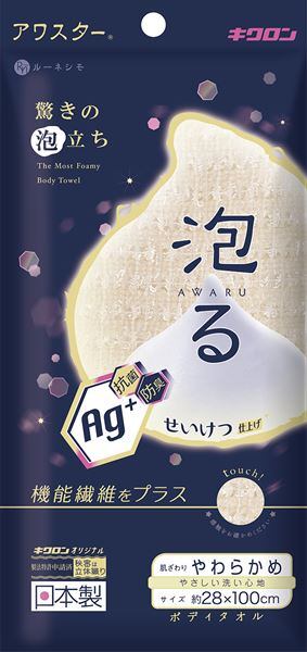 ■【説明】:驚きの泡立ちで大人気のアワスターシリーズに、抗菌・防臭効果のある機能繊維をプラスしたタイプが新発売!銀系抗菌剤が練りこまれた抗菌効果のある糸を使用しているため、細菌の繁殖を抑え、防臭効果を示します。超極細66ナイロン繊維をたっぷり使用した、やわらかな洗い心地の肌ざわり「やわらかめ」タイプ。インバスになじむおしゃれな「ベージュカラー」です。