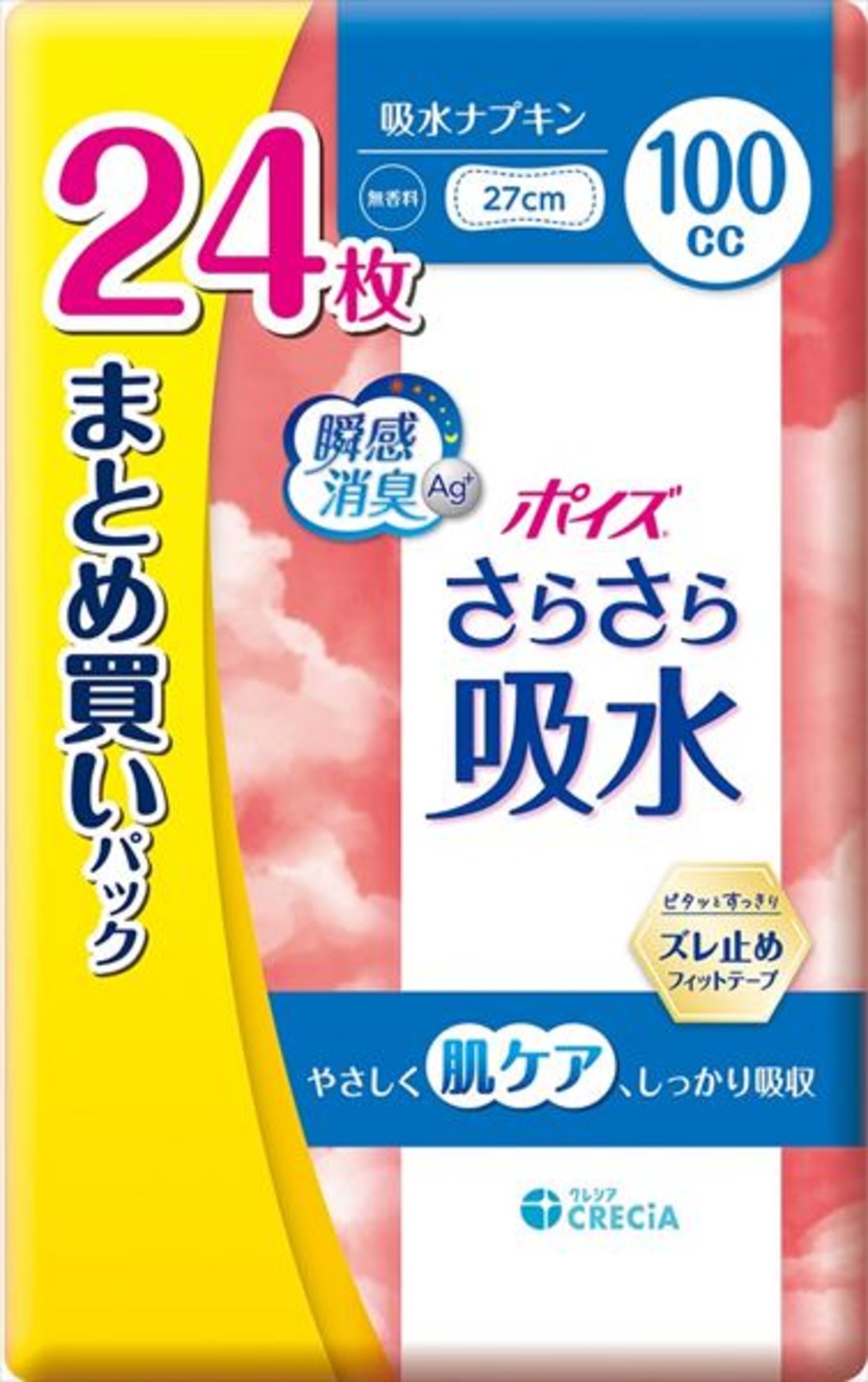 ■【説明】:●ピタッとすっきりズレ止めフィットテープを新採用●キレイがつづくお肌快適抗菌シートで肌トラブルを軽減●素肌と同じ弱酸性●スピード吸収&モレブロック●ニオイをすぐに消臭&24時間抗菌●ムレにくい全面通気性●かわいい花柄エンボス●無香料●入数2倍のまとめ買いパック 吸収量の目安:100cc パッドサイズ:長さ27cm