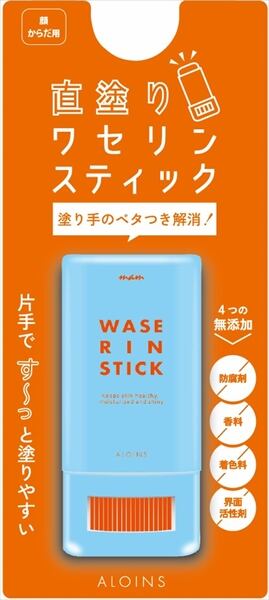 ■【説明】:★直塗りタイプのワセリンスティック★「スティックのワセリンって便利じゃない??」その一言から商品化しました。直塗りタイプのスティック状ワセリンだから、塗り手のベタつき知らず!顔・からだ、全身につかえる。片手です〜っと塗りやすい。4つの無添加「防腐剤・香料・着色料・界面活性剤」