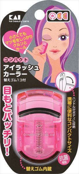 ■【説明】:ハンドルがボディに収納できる、携帯に便利なコンパクトサイズのアイラッシュカーラーです。まぶたの形に合わせた自然なカーブとシリコンゴムで美しくカールできます。抗菌プラスチックを使用。抗菌シリコンゴム使用でデリケートなマツ毛を傷めません。替ゴム1コ付きです。