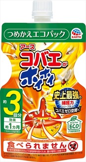 ■【説明】:●つめかえエコパック:コバエがホイホイ約3回分入。●史上最強の捕獲力(シリーズ史上)コバエゼロ空間へ(※1立方メートル空間で、ショウジョウバエ類・ノミバエ類の1種に対して、約90%の捕獲性能を確認。すべてのコバエに効果があるわけではありません。●コバエの習性を知りつくしたコバエ駆除剤。●紹興酒と黒酢の香り、魚介成分でコバエを「強力誘引」し、(ゼリーにもぐらせ・退治)します。●コバエがホイホイの容器を再利用してください(本品に容器は含まれません)※食べられません:子供や認知症の方などの誤食等を防ぐため、置き場所に注意する。・Act For ECO・【プラ使用量削減】【適用害虫】ショウジョウバエ類、ノミバエ類【使用期間】標準使用期間:1回分(約39g)1ヵ月(入れた量、使用環境により異なります)