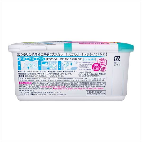 ■【説明】:たっぷりの洗浄液で、便器から床まで汚れをスッキリ落とせるトイレ用お掃除シートです。厚手で丈夫なので、汚れが手につかず、安心してお掃除できます。除菌・抗菌※1に加え、ウイルス除去※2も。使用後はそのままトイレに流せます。すっきりとしたミントの香り。※1すべての菌を除菌・抗菌するわけではありません。※2すべてのウイルスを除去するわけではありません。エンベロープタイプのウイルス1種で効果を検証。