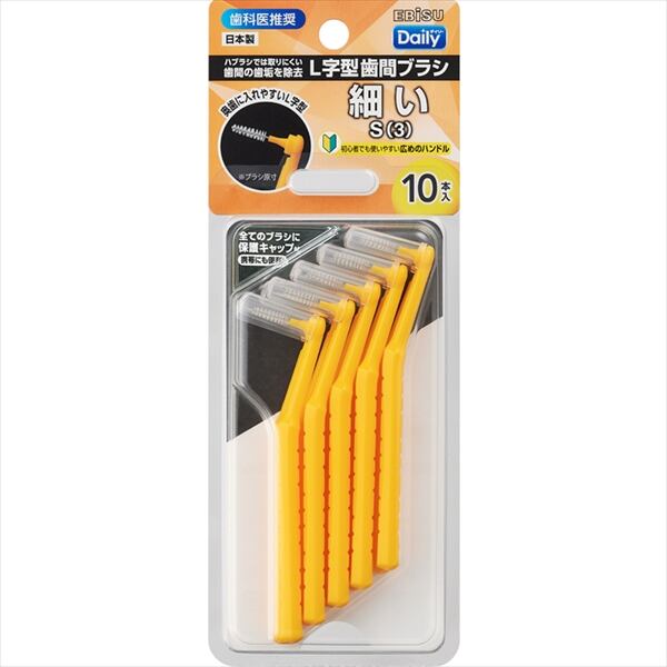 ■【説明】:ハブラシでは取りにくい歯間の歯垢を除去。お手入れしにくい奥歯の歯間に入れやすいL字型歯間ブラシ。全てのブラシに保護キャップ付で衛生的かつ携帯に便利。初心者でも安定して持てる広めのハンドルで向きが定めやすく、狙いやすい。歯ぐきの退縮が少なくすきまが少し見える方におすすめの細い(S)サイズ。10本入。日本製。歯科医推奨。