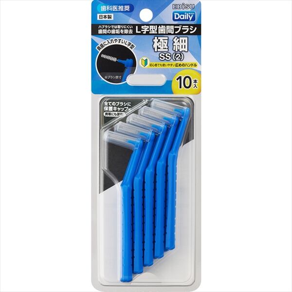 ■【説明】:ハブラシでは取りにくい歯間の歯垢を除去。お手入れしにくい奥歯の歯間に入れやすいL字型歯間ブラシ。全てのブラシに保護キャップ付で衛生的かつ携帯に便利。初心者でも安定して持てる広めのハンドルで向きが定めやすく、狙いやすい。歯ぐきの退縮がわずかですきまがあまり見えない方におすすめの極細(SS)サイズ。10本入。日本製。歯科医推奨。