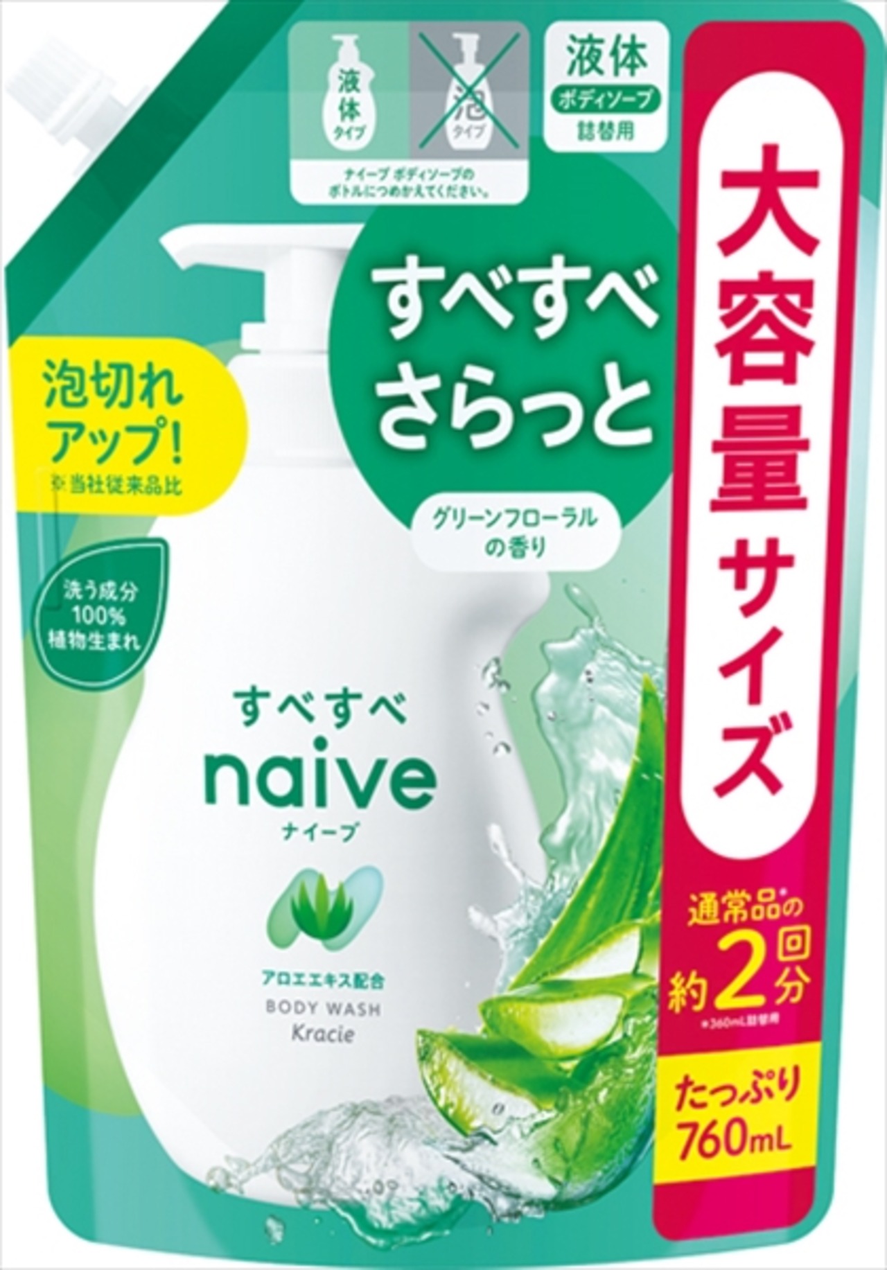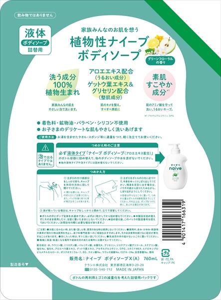 ■【説明】:家族みんなで使えるボディソープ。肌のキメを整え、すべすべ素肌に。グリーンフローラルの香り。