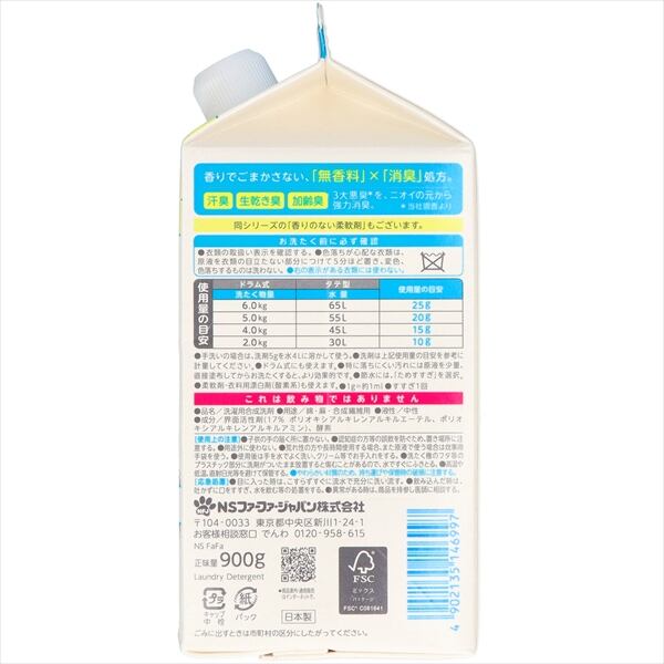 ■【説明】:無香料、だけじゃない。ニオイの少ない原料を厳選した香りのない洗剤(濃縮タイプ)。エコパック。◆無香料だからこそ気になる、「原料のニオイ」まで研究し、無臭に近づけました。◆植物由来の抗菌*防臭。香りでごまかさず、部屋干しや、着衣中のイヤなニオイの発生を防ぎます。◆4つの無添加(香料・着色料・漂白剤・蛍光剤)。◆安心の汚れ落ち。洗浄に必要な成分は外しません。◆すすぎ1回。日本製。