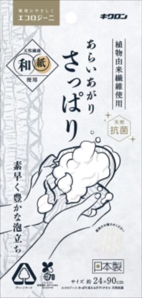 ■【説明】:天然繊維「和紙」使用でオイリー肌の方にもおすすめのさっぱり洗えるボディタオルです。あぶらとり紙のように余分な脂分を吸着させる「和紙」を編み込むことで、さっぱり洗え程よい刺激がくせになる洗い心地を実現させました。天然の抗菌効果があるポリ乳酸繊維と再生PET使用のポリエステルを、空間を作って一緒に編み上げているので泡立ち水切れに優れ衛生的で環境にも配慮しています。パッケージには再生紙を使用しています。