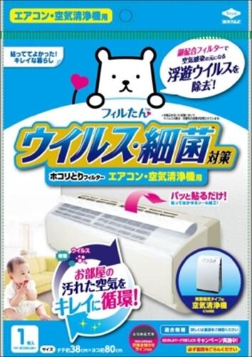 ■【説明】:エアコンや空気清浄機に貼るだけで、室内の浮遊ウィルスや細菌を除去。お部屋の汚れた空気をキレイに循環します!銀配合フィルターで浮遊ウイルスや細菌を除去します。粘着シール加工なので簡単・キレイに取付け、取外しが可能です。フィルターが汚れてくると、「とりかえてネ」サインが浮き出て交換時期をお知らせします。