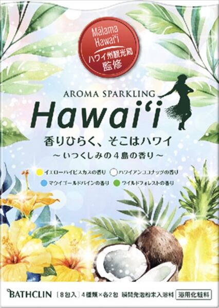 ■【説明】:●入れた瞬間シュワシュワッと発泡するビーズ(発泡剤)により、フレッシュでボリュームのある香りが浴室いっぱいに広がる(独自開発の「スプラッシュエア香法」を採用)●ハワイ州観光局監修●ハワイ主要4島(オアフ島・マウイ島・ハワイ島・カウアイ島)を代表する香りを選定●オーガニックホホバオイルと月見草オイルの2つの保湿成分配合。湯上がり後もお肌しっとり●赤ちゃん(生後3か月以上)と一緒に入浴する時も使えます