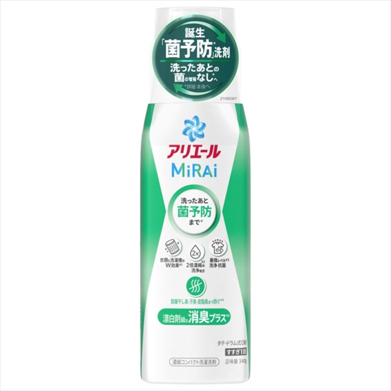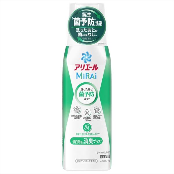 ■【説明】:アリエールMiRAi。誕生「菌」洗剤。洗った後の菌の増殖なしへ。濃縮コンパクト洗濯洗剤。衣類と洗濯槽のW効果。2倍濃縮の洗浄処方。最強レベル洗浄抗菌。部屋干し臭・汗臭・皮脂臭まで防ぐ。