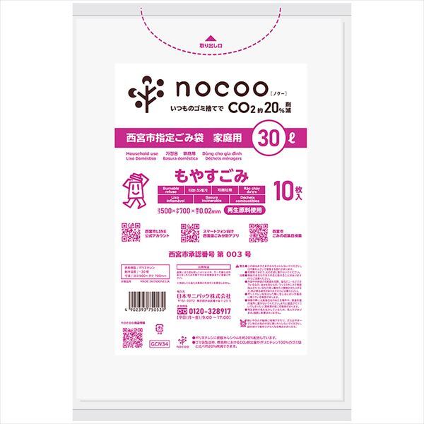 ■【説明】:西宮市指定ごみ袋、もやすごみ用平袋30L10枚。nocoo素材を使用し、二酸化炭素を20%削減。